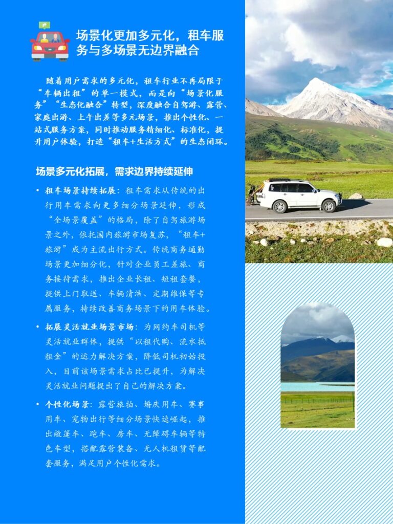 汽车租赁用户的需求多种多样,从短期城市出行和商务旅行到休闲旅行,需要各种类型的车辆,从经济型轿车到豪华SUV。用户需要灵活的解决方案,包括数字化、非接触式预订和个性化服务。租车用途已从单纯的旅行转向日常出行。休闲游客通常优先考虑经济实惠的交通方式,根据预算选择经济型到豪华型车型。商务旅客需要可靠的高端车辆以及高效、通常为非接触式的取车/还车服务。城市/短期用户需要灵活的按需租车(共享汽车)服务,用于短途出行,通常使用移动应用程序以避免传统柜台的等待时间。特殊需求需要更大的车辆,例如SUV车型或MPV车型,用于家庭或团体出行等,不同租车消费者群体都展现出了越来越显著的个性化偏好。